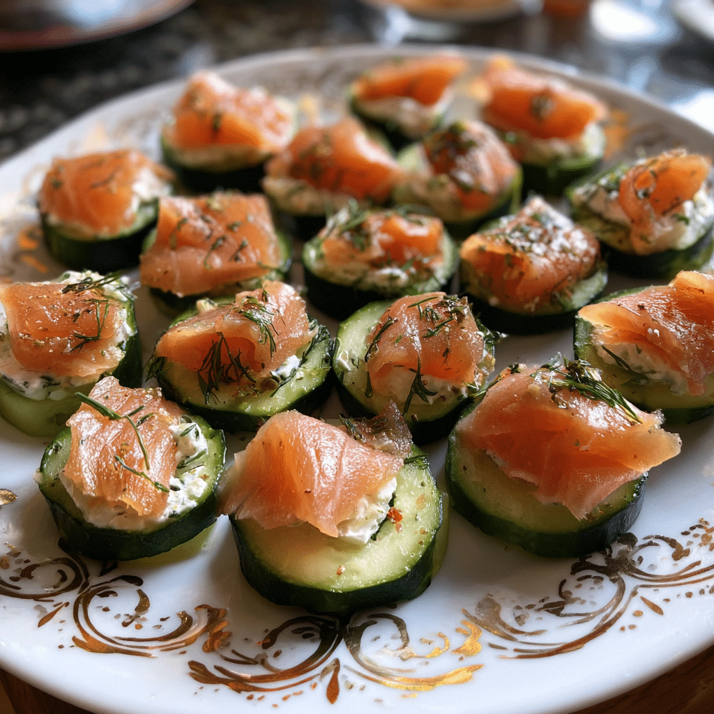 A fresh and elegant appetizer featuring crisp cucumber slices topped with creamy herbed cheese and tender smoked salmon.