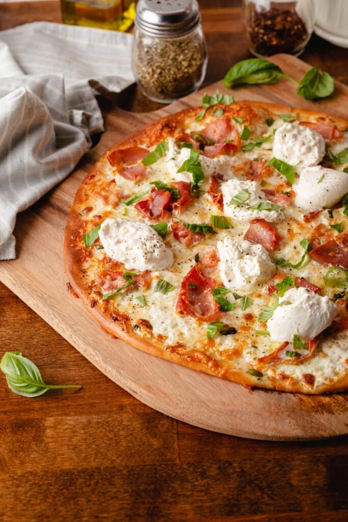 This pizza is best enjoyed fresh. If needed, store leftovers in an airtight container in the refrigerator for up to one day. Reheat in a hot oven for a few minutes to restore crispness. Avoid microwaving, as it softens the crust and affects the burrata texture.