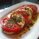 A fresh and simple salad made with sliced ripe tomatoes and creamy mozzarella, finished with olive oil and herbs for a light and refreshing dish.