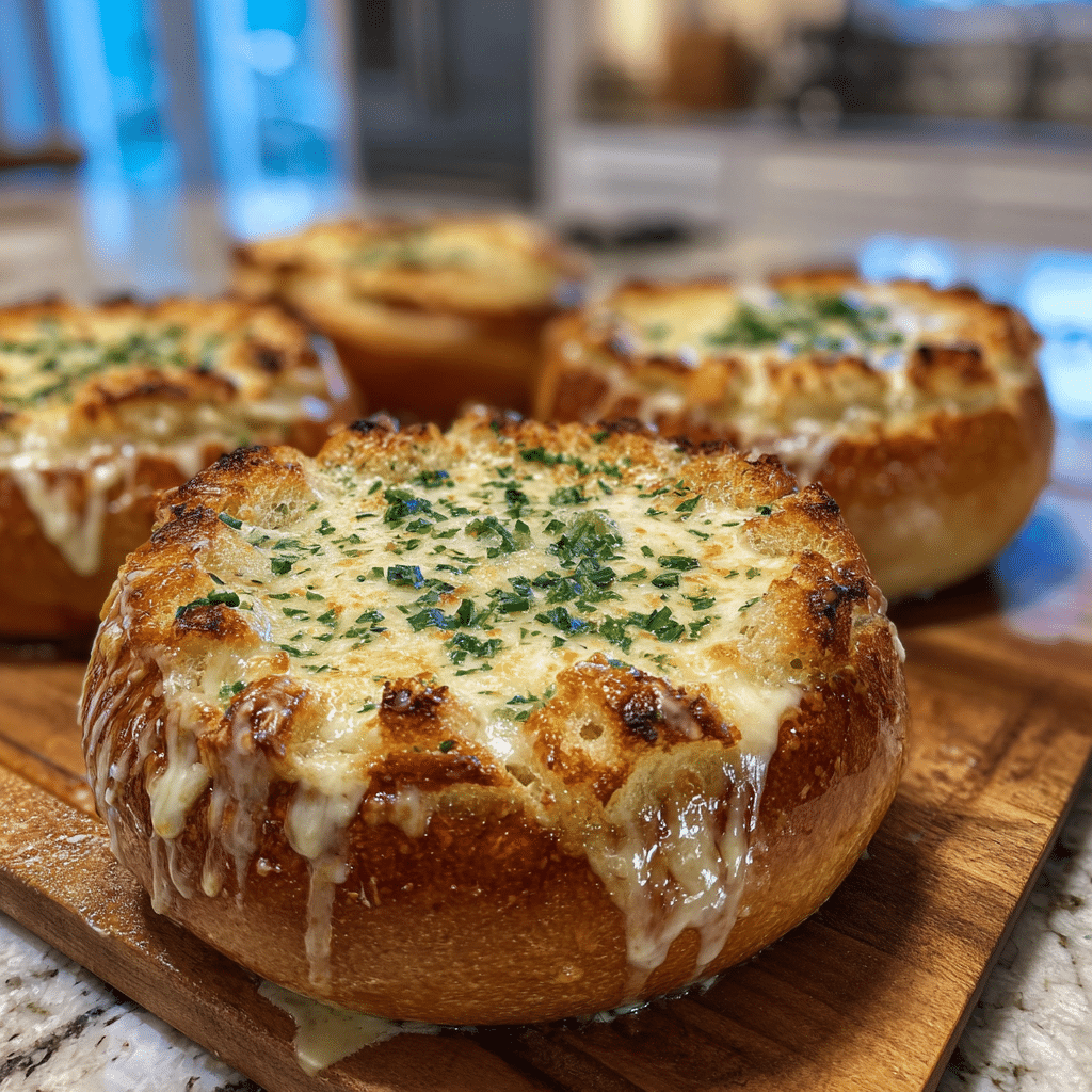 Store leftovers in an airtight container or wrap in foil for up to 3 days. Reheat in a 350°F (175°C) oven for 10–12 minutes to restore the crisp edges. The microwave works for reheating but may soften the bread. To prep ahead, make the garlic bread bowls in advance and fill them just before baking.